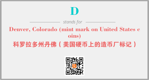 上述内容是“Denver, Colorado (mint mark on United States coins)”作为“D”的缩写,解释为“科罗拉多州丹佛(美国硬币上的造币厂标记)”时的信息,以及英文缩略词D所代表的英文单词,其对应的中文拼音、详细解释以及在英文中的流行度和相关分类、应用领域及应用示例等。