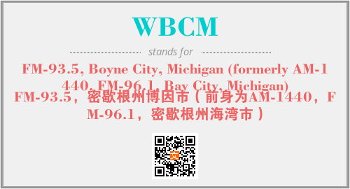 上述内容是“FM-93.5, Boyne City, Michigan (formerly AM-1440, FM-96.1, Bay City, Michigan)”作为“WBCM”的缩写,解释为“FM-93.5,密歇根州博因市(前身为AM-1440,FM-96.1,密歇根州海湾市)”时的信息,以及英文缩略词WBCM所代表的英文单词,其对应的中文拼音、详细解释以及在英文中的流行度和相关分类、应用领域及应用示例等。