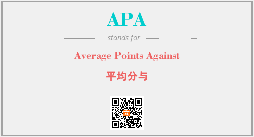英文缩略词“APA”经常作为“Average Points Against”的英文缩写来使用,中文表示:“平均分与”。本文将详细介绍英文缩写词APA所代表英文单词,其对应的中文拼音、详细解释以及在英语中的流行度。此外,还有关于缩略词APA的分类、应用领域及相关应用示例等。