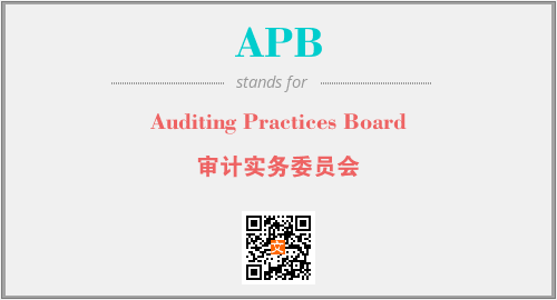英文缩略词“APB”经常作为“Auditing Practices Board”的英文缩写来使用,中文表示:“审计实务委员会”。本文将详细介绍英文缩写词APB所代表英文单词,其对应的中文拼音、详细解释以及在英语中的流行度。此外,还有关于缩略词APB的分类、应用领域及相关应用示例等。