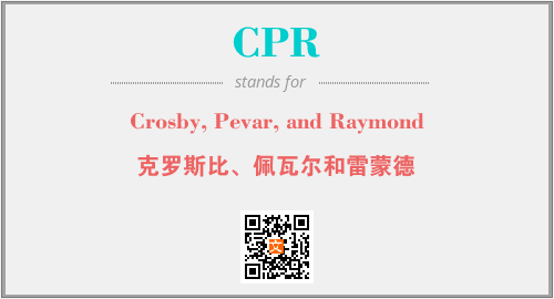 上述内容是“Crosby, Pevar, and Raymond”作为“CPR”的缩写,解释为“克罗斯比、佩瓦尔和雷蒙德”时的信息,以及英文缩略词CPR所代表的英文单词,其对应的中文拼音、详细解释以及在英文中的流行度和相关分类、应用领域及应用示例等。