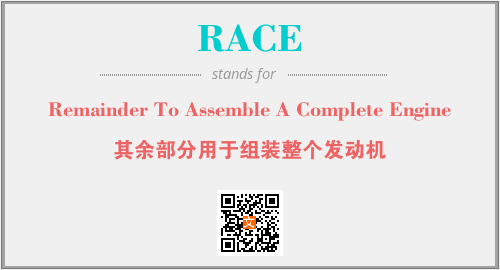 上述内容是“Remainder To Assemble A Complete Engine”作为“RACE”的缩写,解释为“其余部分用于组装整个发动机”时的信息,以及英文缩略词RACE所代表的英文单词,其对应的中文拼音、详细解释以及在英文中的流行度和相关分类、应用领域及应用示例等。