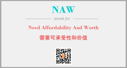 上述内容是“Need Affordability And Worth”作为“NAW”的缩写,解释为“需要可承受性和价值”时的信息,以及英文缩略词NAW所代表的英文单词,其对应的中文拼音、详细解释以及在英文中的流行度和相关分类、应用领域及应用示例等。