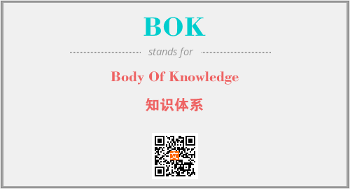 英文缩略词“BOK”经常作为“Body Of Knowledge”的英文缩写来使用,中文表示:“知识体系”。本文将详细介绍英文缩写词BOK所代表英文单词,其对应的中文拼音、详细解释以及在英语中的流行度。此外,还有关于缩略词BOK的分类、应用领域及相关应用示例等。