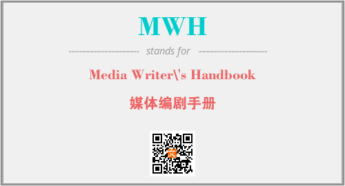 上述内容是“Media Writer\'s Handbook”作为“MWH”的缩写,解释为“媒体编剧手册”时的信息,以及英文缩略词MWH所代表的英文单词,其对应的中文拼音、详细解释以及在英文中的流行度和相关分类、应用领域及应用示例等。