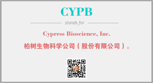 上述内容是“Cypress Bioscience, Inc.”作为“CYPB”的缩写,解释为“柏树生物科学公司(股份有限公司)。”时的信息,以及英文缩略词CYPB所代表的英文单词,其对应的中文拼音、详细解释以及在英文中的流行度和相关分类、应用领域及应用示例等。