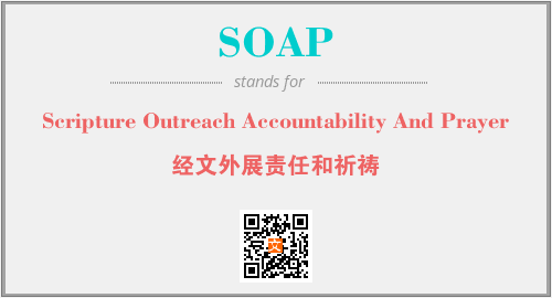 上述内容是“Scripture Outreach Accountability And Prayer”作为“SOAP”的缩写,解释为“经文外展责任和祈祷”时的信息,以及英文缩略词SOAP所代表的英文单词,其对应的中文拼音、详细解释以及在英文中的流行度和相关分类、应用领域及应用示例等。