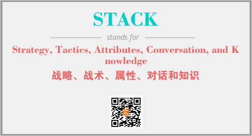 上述内容是“Strategy, Tactics, Attributes, Conversation, and Knowledge”作为“STACK”的缩写,解释为“战略、战术、属性、对话和知识”时的信息,以及英文缩略词STACK所代表的英文单词,其对应的中文拼音、详细解释以及在英文中的流行度和相关分类、应用领域及应用示例等。