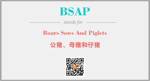 英文缩略词“BSAP”经常作为“Boars Sows And Piglets”的英文缩写来使用,中文表示:“公猪、母猪和仔猪”。本文将详细介绍英文缩写词BSAP所代表英文单词,其对应的中文拼音、详细解释以及在英语中的流行度。此外,还有关于缩略词BSAP的分类、应用领域及相关应用示例等。
