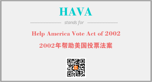 上述内容是“Help America Vote Act of 2002”作为“HAVA”的缩写,解释为“2002年帮助美国投票法案”时的信息,以及英文缩略词HAVA所代表的英文单词,其对应的中文拼音、详细解释以及在英文中的流行度和相关分类、应用领域及应用示例等。