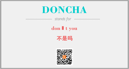 上述内容是“don´t you”作为“DONCHA”的缩写,解释为“不是吗”时的信息,以及英文缩略词DONCHA所代表的英文单词,其对应的中文拼音、详细解释以及在英文中的流行度和相关分类、应用领域及应用示例等。
