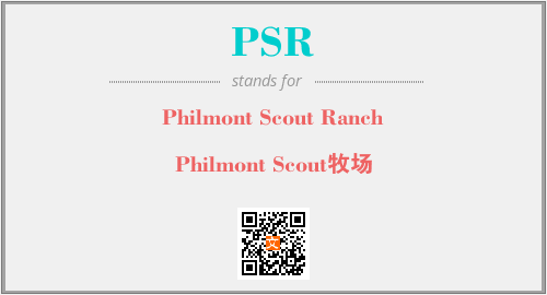 上述内容是“Philmont Scout Ranch”作为“PSR”的缩写,解释为“Philmont Scout牧场”时的信息,以及英文缩略词PSR所代表的英文单词,其对应的中文拼音、详细解释以及在英文中的流行度和相关分类、应用领域及应用示例等。