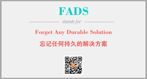 上述内容是“Forget Any Durable Solution”作为“FADS”的缩写,解释为“忘记任何持久的解决方案”时的信息,以及英文缩略词FADS所代表的英文单词,其对应的中文拼音、详细解释以及在英文中的流行度和相关分类、应用领域及应用示例等。