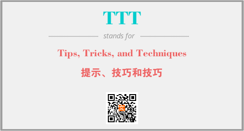 上述内容是“Tips, Tricks, and Techniques”作为“TTT”的缩写,解释为“提示、技巧和技巧”时的信息,以及英文缩略词TTT所代表的英文单词,其对应的中文拼音、详细解释以及在英文中的流行度和相关分类、应用领域及应用示例等。