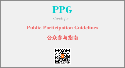 上述内容是“Public Participation Guidelines”作为“PPG”的缩写,解释为“公众参与指南”时的信息,以及英文缩略词PPG所代表的英文单词,其对应的中文拼音、详细解释以及在英文中的流行度和相关分类、应用领域及应用示例等。
