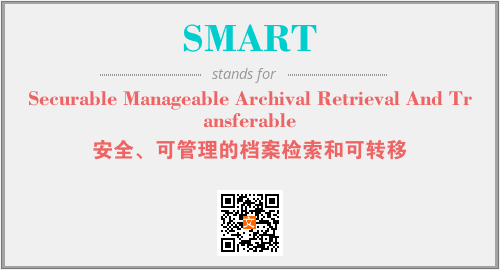 上述内容是“Securable Manageable Archival Retrieval And Transferable”作为“SMART”的缩写,解释为“安全、可管理的档案检索和可转移”时的信息,以及英文缩略词SMART所代表的英文单词,其对应的中文拼音、详细解释以及在英文中的流行度和相关分类、应用领域及应用示例等。