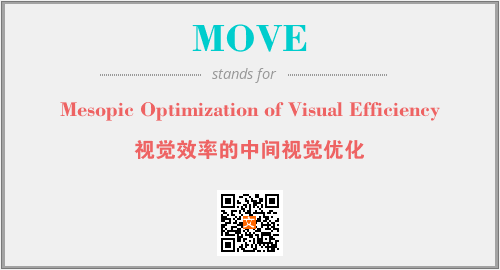 上述内容是“Mesopic Optimization of Visual Efficiency”作为“MOVE”的缩写,解释为“视觉效率的中间视觉优化”时的信息,以及英文缩略词MOVE所代表的英文单词,其对应的中文拼音、详细解释以及在英文中的流行度和相关分类、应用领域及应用示例等。