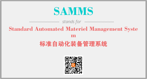 英文缩略词“SAMMS”经常作为“Standard Automated Materiel Management System”的英文缩写来使用,中文表示:“标准自动化装备管理系统”。本文将详细介绍英文缩写词SAMMS所代表英文单词,其对应的中文拼音、详细解释以及在英语中的流行度。此外,还有关于缩略词SAMMS的分类、应用领域及相关应用示例等。