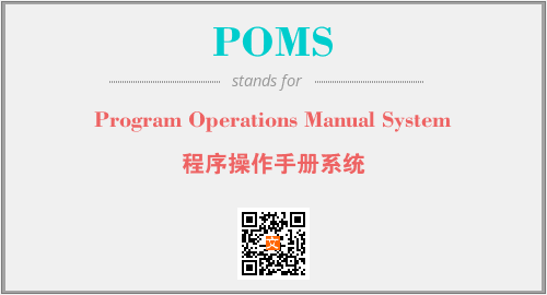 英文缩略词“POMS”经常作为“Program Operations Manual System”的英文缩写来使用,中文表示:“程序操作手册系统”。本文将详细介绍英文缩写词POMS所代表英文单词,其对应的中文拼音、详细解释以及在英语中的流行度。此外,还有关于缩略词POMS的分类、应用领域及相关应用示例等。