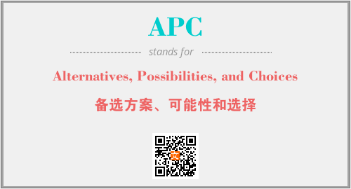 上述内容是“Alternatives, Possibilities, and Choices”作为“APC”的缩写,解释为“备选方案、可能性和选择”时的信息,以及英文缩略词APC所代表的英文单词,其对应的中文拼音、详细解释以及在英文中的流行度和相关分类、应用领域及应用示例等。