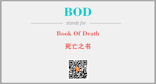 英文缩略词“BOD”经常作为“Book Of Death”的英文缩写来使用,中文表示:“死亡之书”。本文将详细介绍英文缩写词BOD所代表英文单词,其对应的中文拼音、详细解释以及在英语中的流行度。此外,还有关于缩略词BOD的分类、应用领域及相关应用示例等。