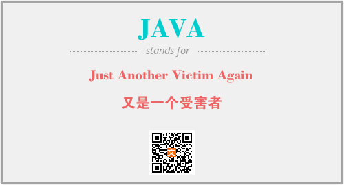 上述内容是“Just Another Victim Again”作为“JAVA”的缩写,解释为“又是一个受害者”时的信息,以及英文缩略词JAVA所代表的英文单词,其对应的中文拼音、详细解释以及在英文中的流行度和相关分类、应用领域及应用示例等。