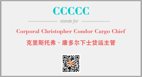 上述内容是“Corporal Christopher Condor Cargo Chief”作为“CCCCC”的缩写,解释为“克里斯托弗·康多尔下士货运主管”时的信息,以及英文缩略词CCCCC所代表的英文单词,其对应的中文拼音、详细解释以及在英文中的流行度和相关分类、应用领域及应用示例等。