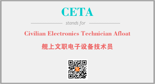 英文缩略词“CETA”经常作为“Civilian Electronics Technician Afloat”的英文缩写来使用,中文表示:“舰上文职电子设备技术员”。本文将详细介绍英文缩写词CETA所代表英文单词,其对应的中文拼音、详细解释以及在英语中的流行度。此外,还有关于缩略词CETA的分类、应用领域及相关应用示例等。