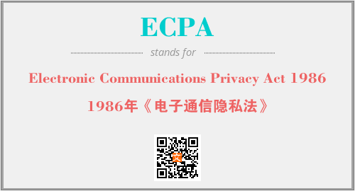 上述内容是“Electronic Communications Privacy Act 1986”作为“ECPA”的缩写,解释为“1986年《电子通信隐私法》”时的信息,以及英文缩略词ECPA所代表的英文单词,其对应的中文拼音、详细解释以及在英文中的流行度和相关分类、应用领域及应用示例等。