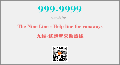 上述内容是“The Nine Line - Help line for runaways”作为“999-9999”的缩写,解释为“九线-逃跑者求助热线”时的信息,以及英文缩略词999-9999所代表的英文单词,其对应的中文拼音、详细解释以及在英文中的流行度和相关分类、应用领域及应用示例等。
