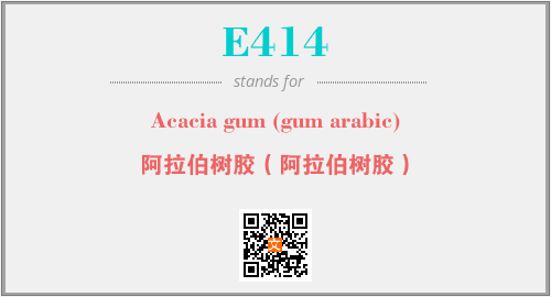 上述内容是“Acacia gum (gum arabic)”作为“E414”的缩写,解释为“阿拉伯树胶(阿拉伯树胶)”时的信息,以及英文缩略词E414所代表的英文单词,其对应的中文拼音、详细解释以及在英文中的流行度和相关分类、应用领域及应用示例等。