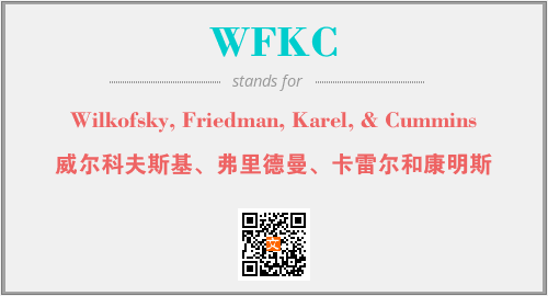 上述内容是“Wilkofsky, Friedman, Karel, & Cummins”作为“WFKC”的缩写,解释为“威尔科夫斯基、弗里德曼、卡雷尔和康明斯”时的信息,以及英文缩略词WFKC所代表的英文单词,其对应的中文拼音、详细解释以及在英文中的流行度和相关分类、应用领域及应用示例等。