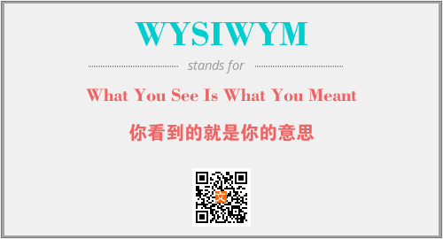 英文缩略词“WYSIWYM”经常作为“What You See Is What You Meant”的英文缩写来使用,中文表示:“你看到的就是你的意思”。本文将详细介绍英文缩写词WYSIWYM所代表英文单词,其对应的中文拼音、详细解释以及在英语中的流行度。此外,还有关于缩略词WYSIWYM的分类、应用领域及相关应用示例等。
