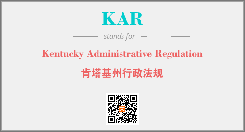上述内容是“Kentucky Administrative Regulation”作为“KAR”的缩写,解释为“肯塔基州行政法规”时的信息,以及英文缩略词KAR所代表的英文单词,其对应的中文拼音、详细解释以及在英文中的流行度和相关分类、应用领域及应用示例等。