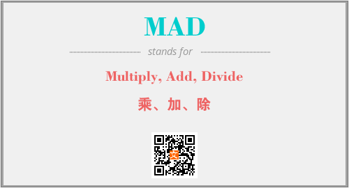 英文缩略词“MAD”经常作为“Multiply, Add, Divide”的英文缩写来使用,中文表示:“乘、加、除”。本文将详细介绍英文缩写词MAD所代表英文单词,其对应的中文拼音、详细解释以及在英语中的流行度。此外,还有关于缩略词MAD的分类、应用领域及相关应用示例等。