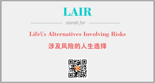 以上为Life\'s Alternatives Involving Risks英文缩略词LAIR的中文解释,以及该英文缩写在英语的流行度、分类和应用领域方面的信息。