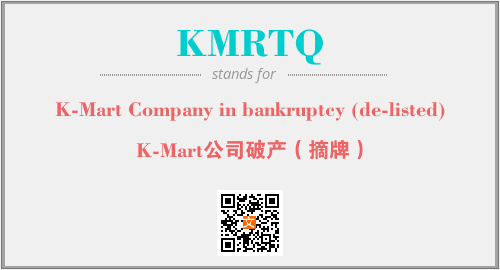 英文缩略词“KMRTQ”经常作为“K-Mart Company in bankruptcy (de-listed)”的英文缩写来使用,中文表示:“K-Mart公司破产(摘牌)”。本文将详细介绍英文缩写词KMRTQ所代表英文单词,其对应的中文拼音、详细解释以及在英语中的流行度。此外,还有关于缩略词KMRTQ的分类、应用领域及相关应用示例等。