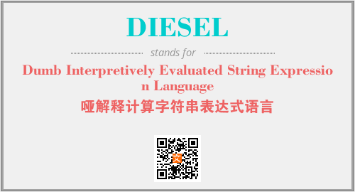 上述内容是“Dumb Interpretively Evaluated String Expression Language”作为“DIESEL”的缩写,解释为“哑解释计算字符串表达式语言”时的信息,以及英文缩略词DIESEL所代表的英文单词,其对应的中文拼音、详细解释以及在英文中的流行度和相关分类、应用领域及应用示例等。