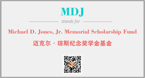 上述内容是“Michael D. Jones, Jr. Memorial Scholarship Fund”作为“MDJ”的缩写,解释为“迈克尔·琼斯纪念奖学金基金”时的信息,以及英文缩略词MDJ所代表的英文单词,其对应的中文拼音、详细解释以及在英文中的流行度和相关分类、应用领域及应用示例等。