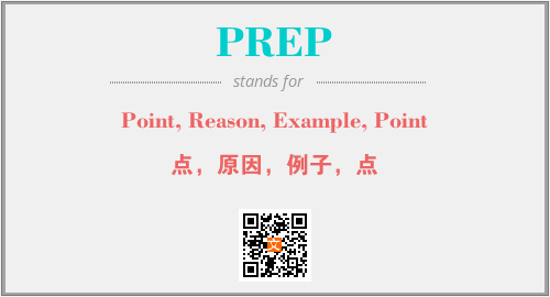 上述内容是“Point, Reason, Example, Point”作为“PREP”的缩写,解释为“点,原因,例子,点”时的信息,以及英文缩略词PREP所代表的英文单词,其对应的中文拼音、详细解释以及在英文中的流行度和相关分类、应用领域及应用示例等。