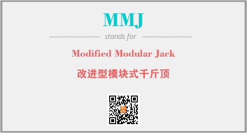 英文缩略词“MMJ”经常作为“Modified Modular Jack”的英文缩写来使用,中文表示:“改进型模块式千斤顶”。本文将详细介绍英文缩写词MMJ所代表英文单词,其对应的中文拼音、详细解释以及在英语中的流行度。此外,还有关于缩略词MMJ的分类、应用领域及相关应用示例等。