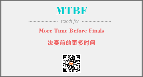英文缩略词“MTBF”经常作为“More Time Before Finals”的英文缩写来使用,中文表示:“决赛前的更多时间”。本文将详细介绍英文缩写词MTBF所代表英文单词,其对应的中文拼音、详细解释以及在英语中的流行度。此外,还有关于缩略词MTBF的分类、应用领域及相关应用示例等。