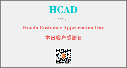 英文缩略词“HCAD”经常作为“Honda Customer Appreciation Day”的英文缩写来使用,中文表示:“本田客户感谢日”。本文将详细介绍英文缩写词HCAD所代表英文单词,其对应的中文拼音、详细解释以及在英语中的流行度。此外,还有关于缩略词HCAD的分类、应用领域及相关应用示例等。