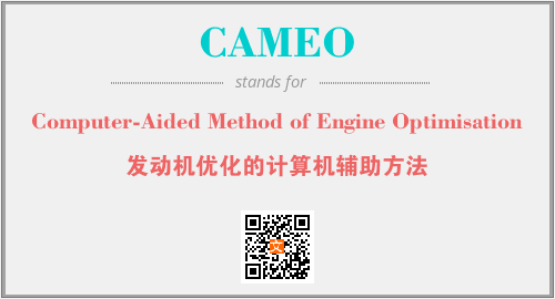 上述内容是“Computer-Aided Method of Engine Optimisation”作为“CAMEO”的缩写,解释为“发动机优化的计算机辅助方法”时的信息,以及英文缩略词CAMEO所代表的英文单词,其对应的中文拼音、详细解释以及在英文中的流行度和相关分类、应用领域及应用示例等。