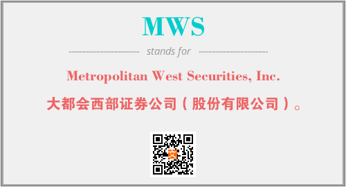 上述内容是“Metropolitan West Securities, Inc.”作为“MWS”的缩写,解释为“大都会西部证券公司(股份有限公司)。”时的信息,以及英文缩略词MWS所代表的英文单词,其对应的中文拼音、详细解释以及在英文中的流行度和相关分类、应用领域及应用示例等。