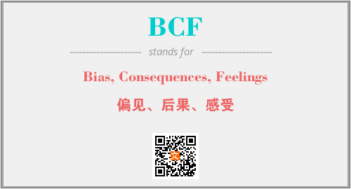 上述内容是“Bias, Consequences, Feelings”作为“BCF”的缩写,解释为“偏见、后果、感受”时的信息,以及英文缩略词BCF所代表的英文单词,其对应的中文拼音、详细解释以及在英文中的流行度和相关分类、应用领域及应用示例等。