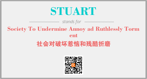 上述内容是“Society To Undermine Annoy ad Ruthlessly Torment”作为“STUART”的缩写,解释为“社会对破坏惹恼和残酷折磨”时的信息,以及英文缩略词STUART所代表的英文单词,其对应的中文拼音、详细解释以及在英文中的流行度和相关分类、应用领域及应用示例等。