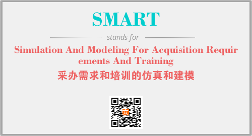 上述内容是“Simulation And Modeling For Acquisition Requirements And Training”作为“SMART”的缩写,解释为“采办需求和培训的仿真和建模”时的信息,以及英文缩略词SMART所代表的英文单词,其对应的中文拼音、详细解释以及在英文中的流行度和相关分类、应用领域及应用示例等。