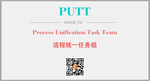 英文缩略词“PUTT”经常作为“Process Unification Task Team”的英文缩写来使用,中文表示:“流程统一任务组”。本文将详细介绍英文缩写词PUTT所代表英文单词,其对应的中文拼音、详细解释以及在英语中的流行度。此外,还有关于缩略词PUTT的分类、应用领域及相关应用示例等。