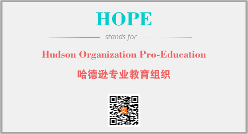 上述内容是“Hudson Organization Pro-Education”作为“HOPE”的缩写,解释为“哈德逊专业教育组织”时的信息,以及英文缩略词HOPE所代表的英文单词,其对应的中文拼音、详细解释以及在英文中的流行度和相关分类、应用领域及应用示例等。